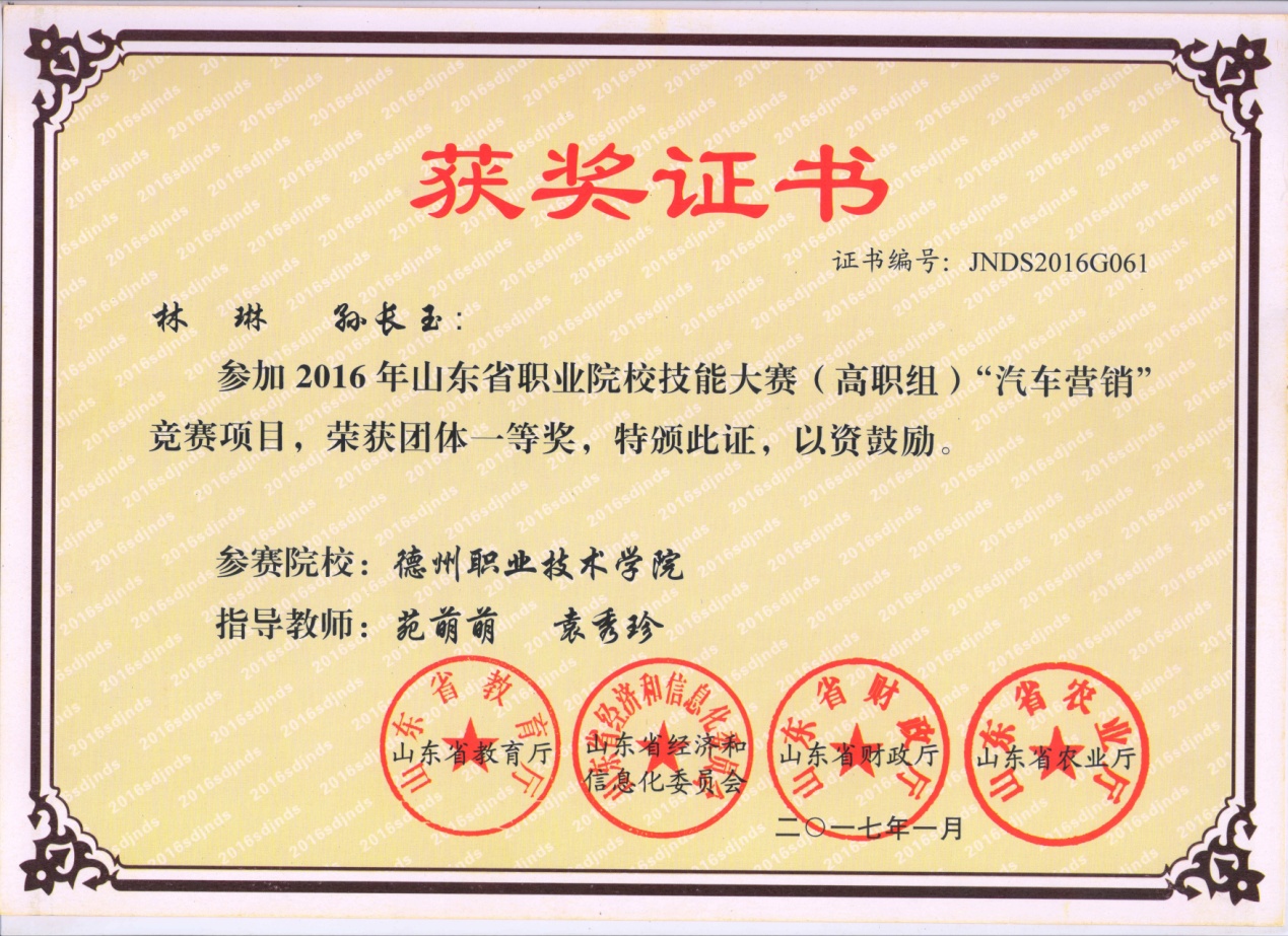 2016年获山东省职业院校技能大赛高职组“汽车营销”一等奖
