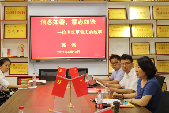 最后,葛伟同志给第一党支部进行党课讲授。她介绍了老红军曾志同志:曾志为党和人民艰苦奋斗了一生,将毕生精力无私地奉献给了中国人民的革命和建设事业,她的高尚品德和优秀情操,赢得了广大干部群众的尊敬和称赞。