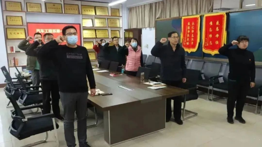 活动伊始,第一党支部的全体党员进行签到并奏唱国歌,随后在邵玉霞同志的领誓下重温入党誓词。