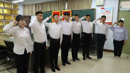 七名预备党员在邵玉霞同志的带领下,面对庄严党旗,进行入党宣誓。