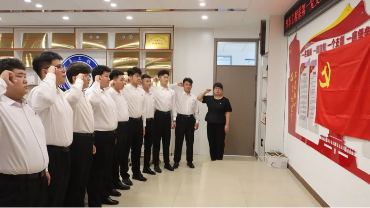 九名预备党员在邵玉霞同志的带领下,面对庄严党旗,进行入党宣誓。