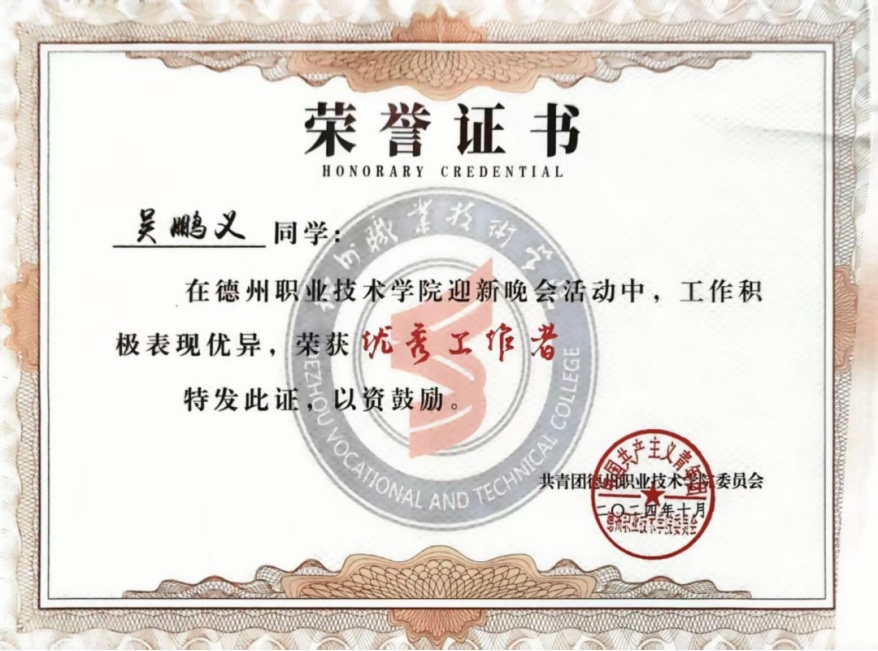 吴鹏义自2023年入校以来,对待学习始终保持着勤奋努力,他制定合理的学习计划,课后经常与老师和同学积极交流,通过不懈的努力,取得了优异的成绩。在课余时间,他积极参加志愿、实践活动。通过丰富的活动平台锻炼自身的能力,不断走出“舒适圈”提升自己的创新能力和综合素质。