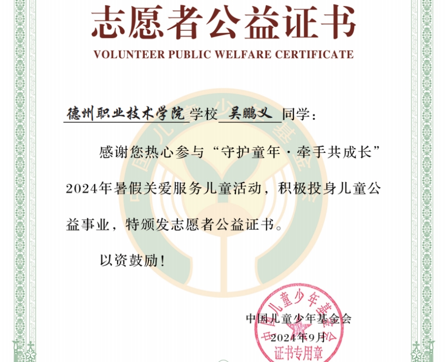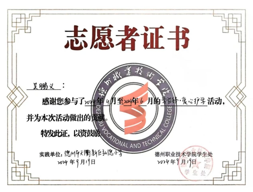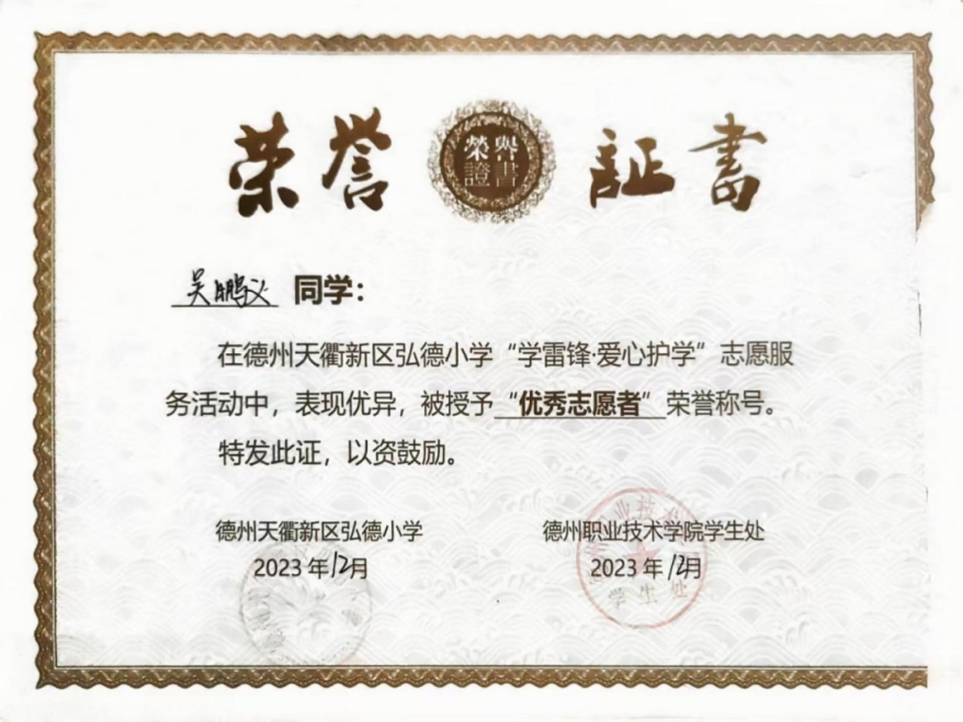 在2024年德州天衢新区弘德小学“学雷锋,爱心护学”活动中被评为“优秀志愿者”