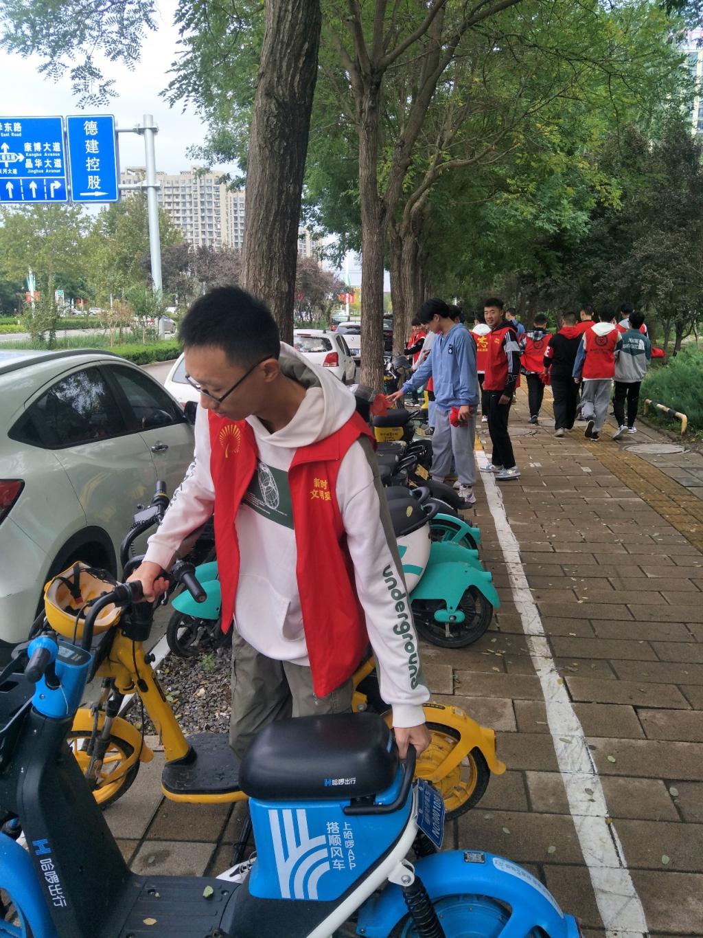 在回来的路上,同学们看到大路两旁的共享单车摆放不整齐,大家积极主动把共享单车摆放整齐,充分实践了188改名taptap青年志愿者的职责。