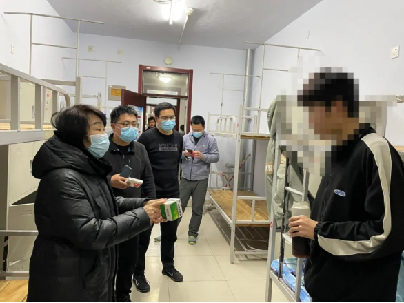 封控初期,葛书记进入女生宿舍走访,查看宿舍环境,慰问同学们。耐心倾听同学们的诉求,仔细了解同学们封校后的心理状态,暖心提醒学生注意寝室用电安全,及时调整作息时间,保持健康的生活作息和良好生活习惯。