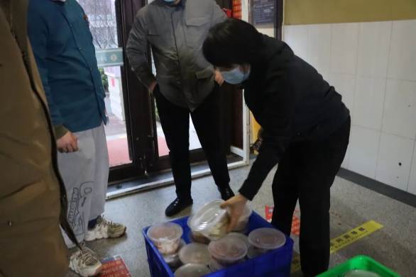 学校封控初期,需要老师们将饭菜送至学生宿舍门口,葛书记带领女教师主动承担起女生宿舍送餐任务。当可口美味的饭菜送到每位学生宿舍门口,学生们一句句暖心的话语,不断激励着疲惫的老师们,继续向下一间宿舍走去