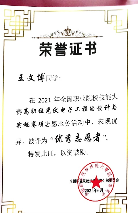 2021年全国职业院校技能大赛—光伏电子设计与实施赛项“优秀志愿者”