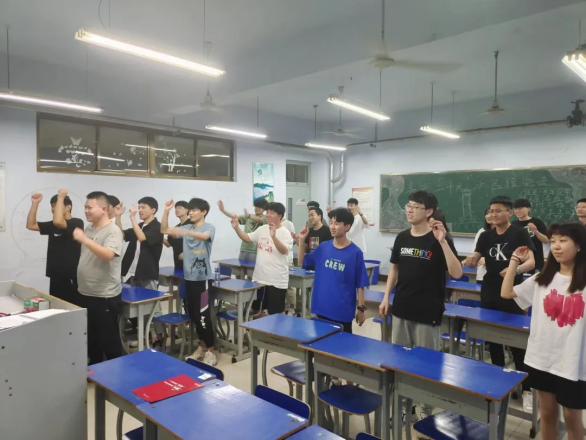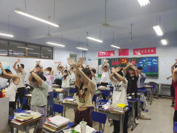 同时,班级里的同学也在跟随抖音直播学习减压操。同学们跟随旋律,用优美的舞姿展现着青春最亮丽的底色。