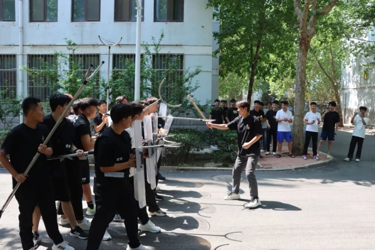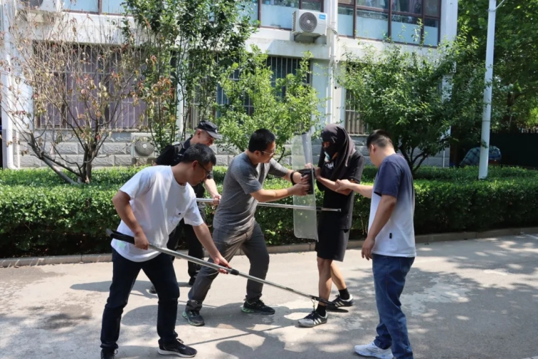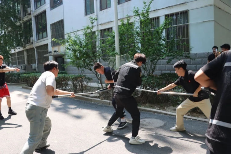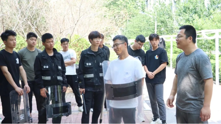 为确保演练顺利进行,我系邀请到了保卫处叶景狼老师来到现场指导,同学们认真观摩,积极提问,仔细学习防暴盾和防暴叉的使用方法及细节。而后由牟海东书记安排此次演练人员的演绎角色,参演的同学被分为“安保人员”和“匪徒”两个阵营,“双方大战”一触即发。