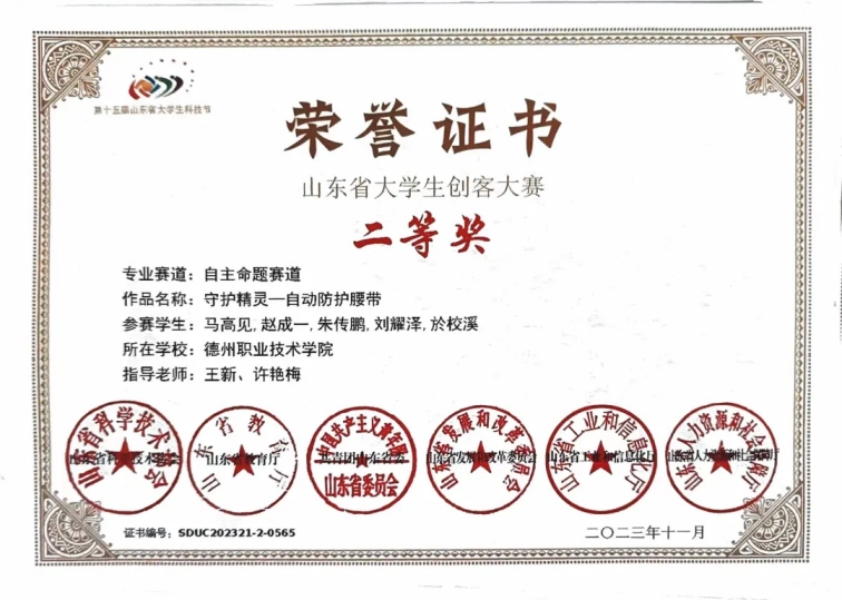 2023年11月,荣获山东省大学生创客大赛“二等奖”