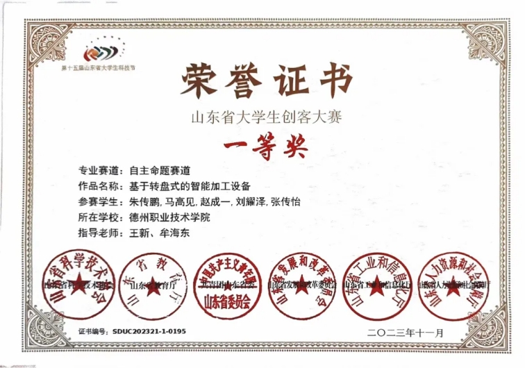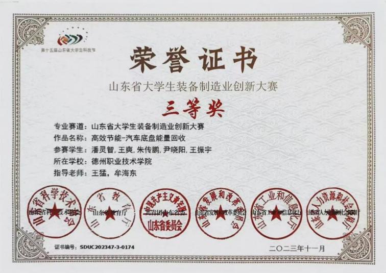 2023年11月,荣获山东省大学生装备制造业创新大赛中“三等奖”