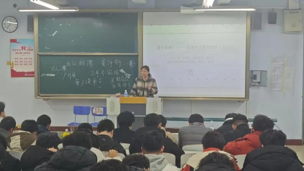 课堂上,袁老师生动讲述了董仲舒“三年不窥园”的典故。《史记》《汉书》均记载董仲舒专心治学,家中虽有花园,却三年不曾踏入一步。