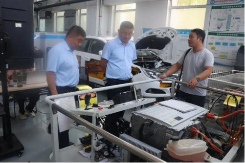 会后,新能源汽车技术教研室主任霍雷刚同志陪同金车汽贸领导到实训基地参观,并考察探讨了订单班生产性实训场景的布局与开发。