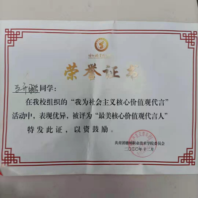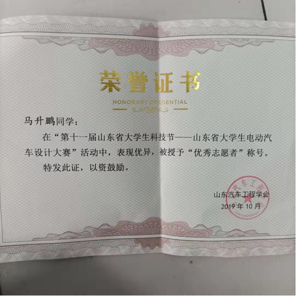 我叫马升鹏,点点体育19级新能源汽车技术二班的一名学生,36期入党积极分子,现担任188改名taptap学生会团总支副书记一职,在这期间我获得“2019年山东省“科技兴鲁”职业技能大赛-新能源汽车营销技能优秀志愿者证书,第十一届山东省大学生科技节-山东省大学生电动汽车设计大赛“优秀志愿者”、2020省政府励志奖学金等。