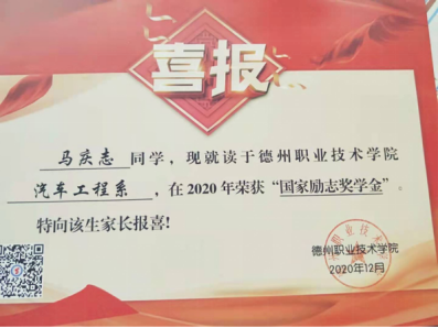 有人曾经说过,人生旅途中,获奖只是一种助推器,它绝不是你最根本的动力器。当然这个助推器也是一股不可小视的力量。对于马庆志而言,国家励志奖学金获奖意义重大。一分耕耘一分收获,国家励志奖学金是对学习努力的肯定,并促进自己明确自我定位、端正学习态度,让马庆志知道了一年以来自己大致的学习状况,并且让自己的辛苦付出有了一个肯定和回报,让他在今后的学习中更加坚定目标,刻苦钻研。