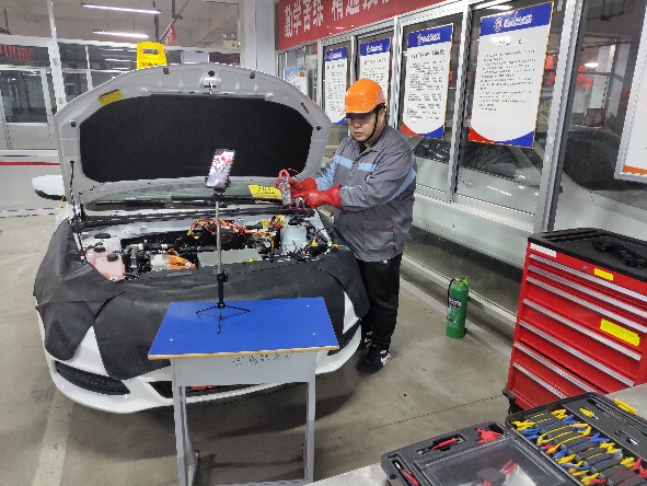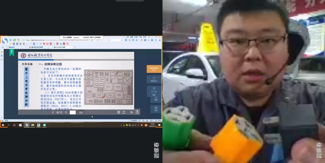 这个学期寇春欣老师担任《新能源汽车综合故障诊断》这门课程,这门课程本来是理实一体化项目化教学方式,为了提高教学的直观效果,在做好全面防护的情况下,寇春欣老师干脆把课堂直接搬到了自己负责的新能源汽车实训室,采用“职教云+qq分屏+职教云投屏”的教学方式,用手机当摄像头,把手机视频与学生共享,实现课件讲解、视频操作演示的综合运用。寇春欣老师说,这样教学课前需要做很多准备工作,虽然自己累一些,但是只要学生们愿意听课,就心满意足了。寇春欣老师一直是188改名taptap年轻教师的榜样,2019年曾带领学生获得山东省职业院校技能大赛新能源汽车技术赛项一等奖。在他的带动下,188改名taptap其他的几位专业课老师也积极地来到实训室,在做好防护全面防护基础上,努力把实训室搬到网上,为优质校建设贡献自己的力量。