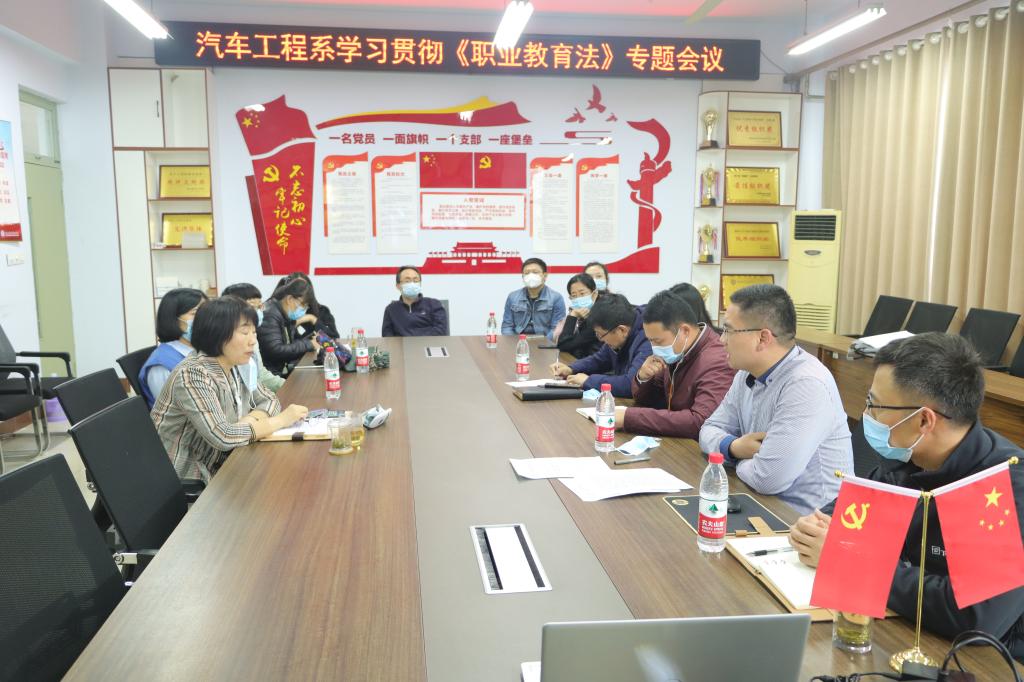 会议上,汽车系副主任艾锋宣贯了学校《关于深入学习宣传和贯彻实施新修订的职业教育法的通知》。