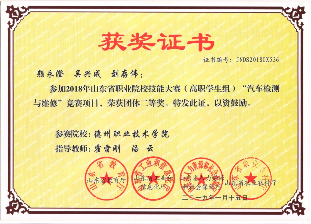 2018年获山东省职业院校技能大赛高职组“汽车营销”一等奖