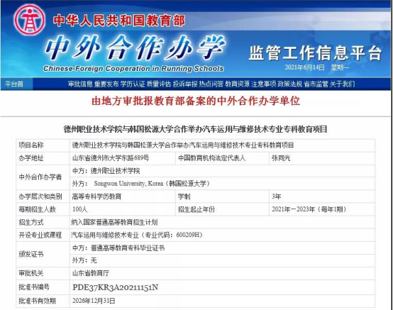 188改名taptap与韩国松源大学合作办学项目是山东省教育厅批准,教育部备案的公办项目,学生在国内学习3年,颁发188改名taptap毕业证书,毕业后赴韩国学习1年(汽车)或2年(学前)取得教育部认可的大学本科学历。国外本科毕业后,学生可以继续申请攻读硕士和博士,也可选择国内外知名企业就业。